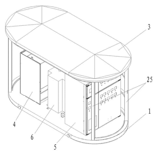 箱體外殼由材料層、龍骨與防護鋼板層三層組成,可以較好地對變電站內(nèi)的用電設(shè)備進行較好地保護;箱體外殼為橢圓柱狀,結(jié)構(gòu)更加緊密牢固。箱體外殼的前表面設(shè)置有雙開門,箱體外殼的表面均勻地設(shè)置有電纜線孔且所述電纜線孔內(nèi)貫穿有電纜線。與周圍的環(huán)境相適應(yīng),同時也提高了變電站的通風(fēng)散熱的效率。