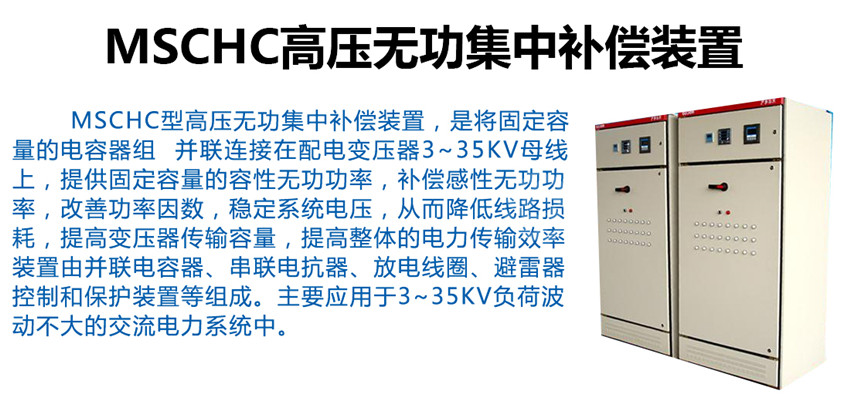 MSCHC型高壓無功集中補償裝置,是將固定容量的電容器組 并聯(lián)連接在配電變壓器3~35kV母線上,提供固定容量的容性無功功率,補償感性無功功率,改善功率因數(shù),穩(wěn)定系統(tǒng)電壓,從而降低線路損耗,提高變壓器傳輸容量,提高整體的電力傳輸效率。裝置由并聯(lián)電容器、串聯(lián)電抗器、放電線圈、避雷器、控制和保護裝置等組成。主要應用于3~35kV負荷波動不大的交流電力系統(tǒng)中